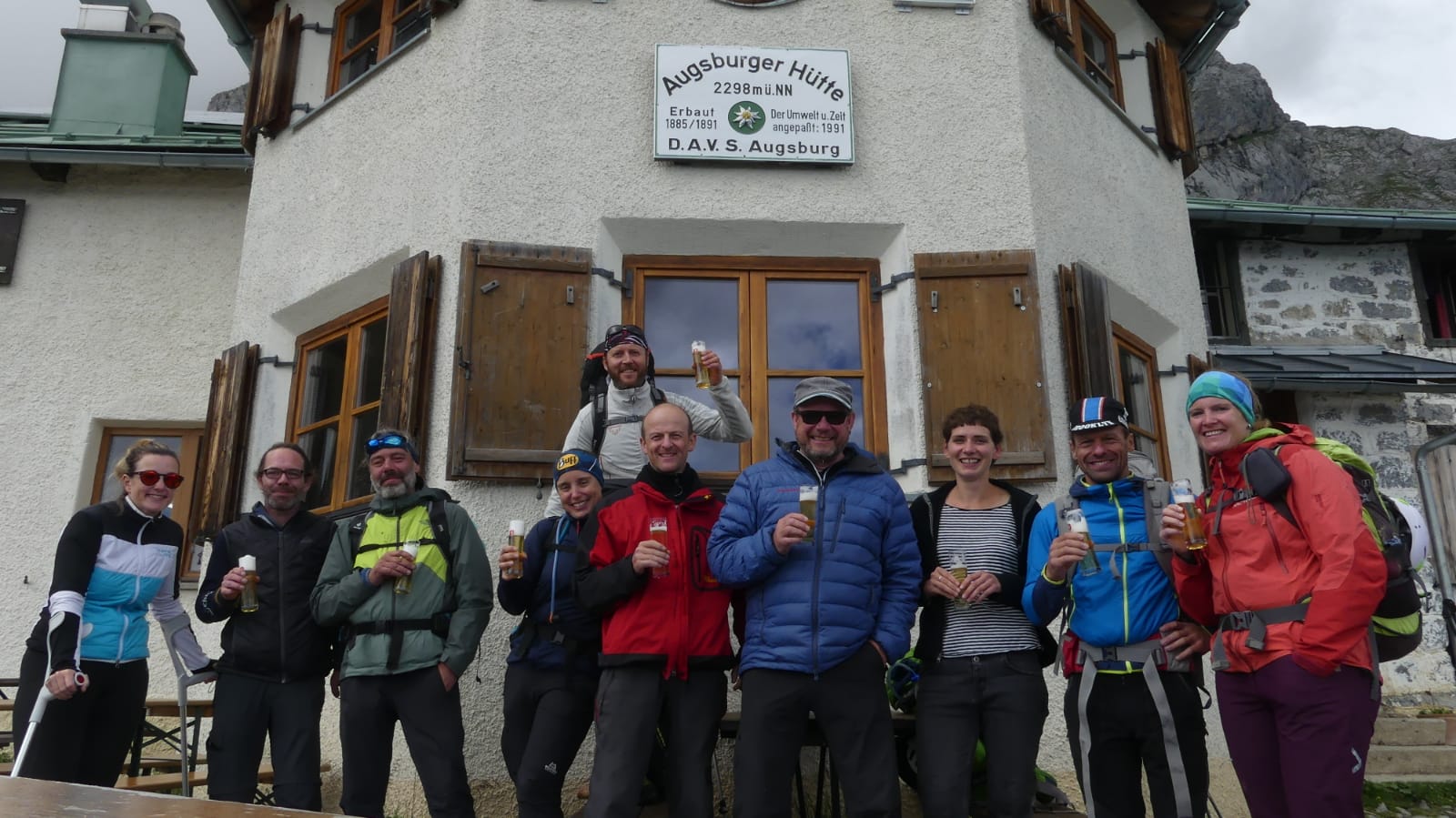 Mit 7 Teilnehmern erreichen wir die Hütte schon nach knapp dreieinhalb Stunden, das sind immerhin 1200 hm da rauf. Bei herrlichem Wetter genießen wir die Ankunft, mit dem traditionellen Begrüßungsschnaps werden wir von den freundlichen Damen des Hüttenpersonals vor der Hütte gleich abgefangen.